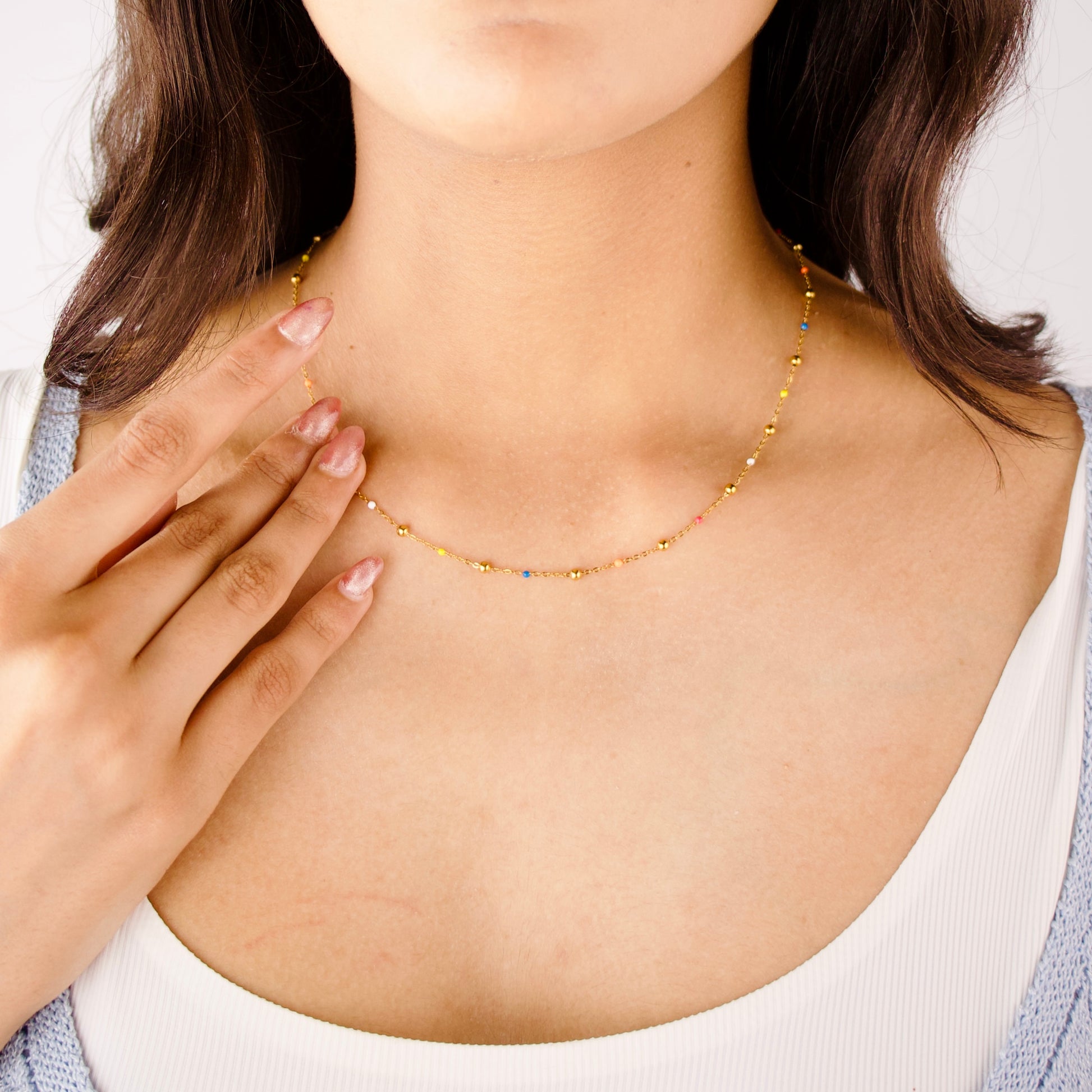 This Candy Pop Chain features a 14 KT gold plating that is skin-safe and waterproof, with a length of 47.3 cm for versatile wear.