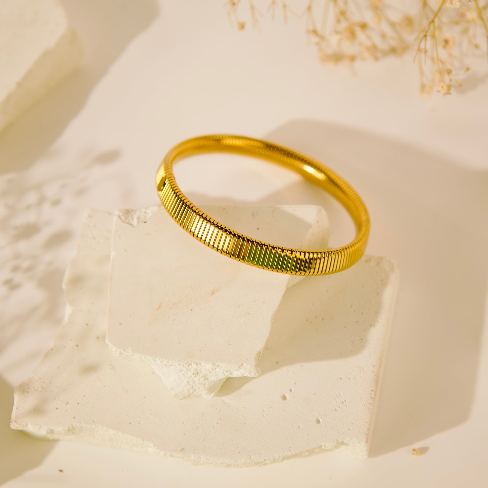 This stretchable circle bracelet features an 18KT gold plating, is skin-safe, and waterproof. It has an inner diameter of 5.7 cm, designed to comfortably fit your wrist while offering durability and style.