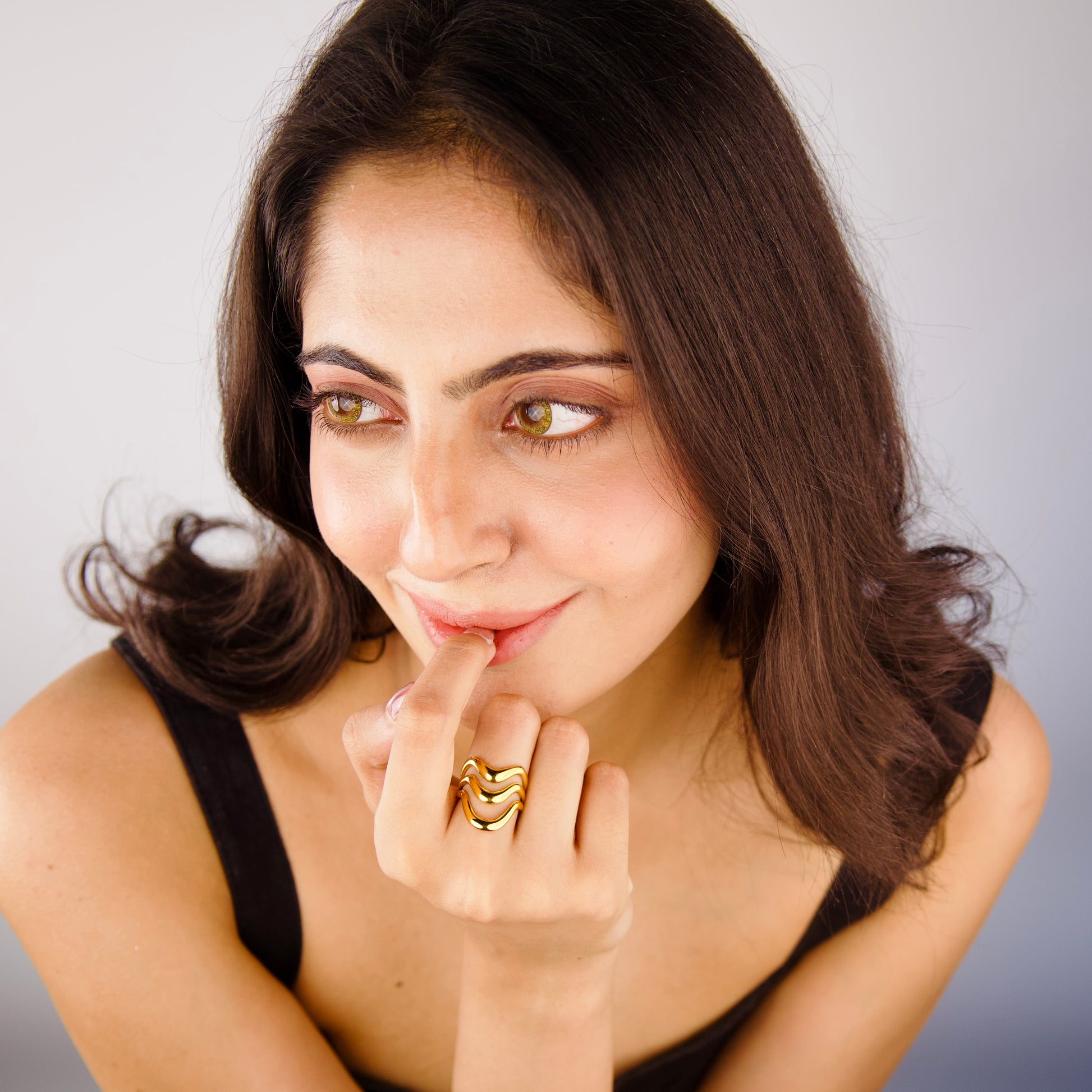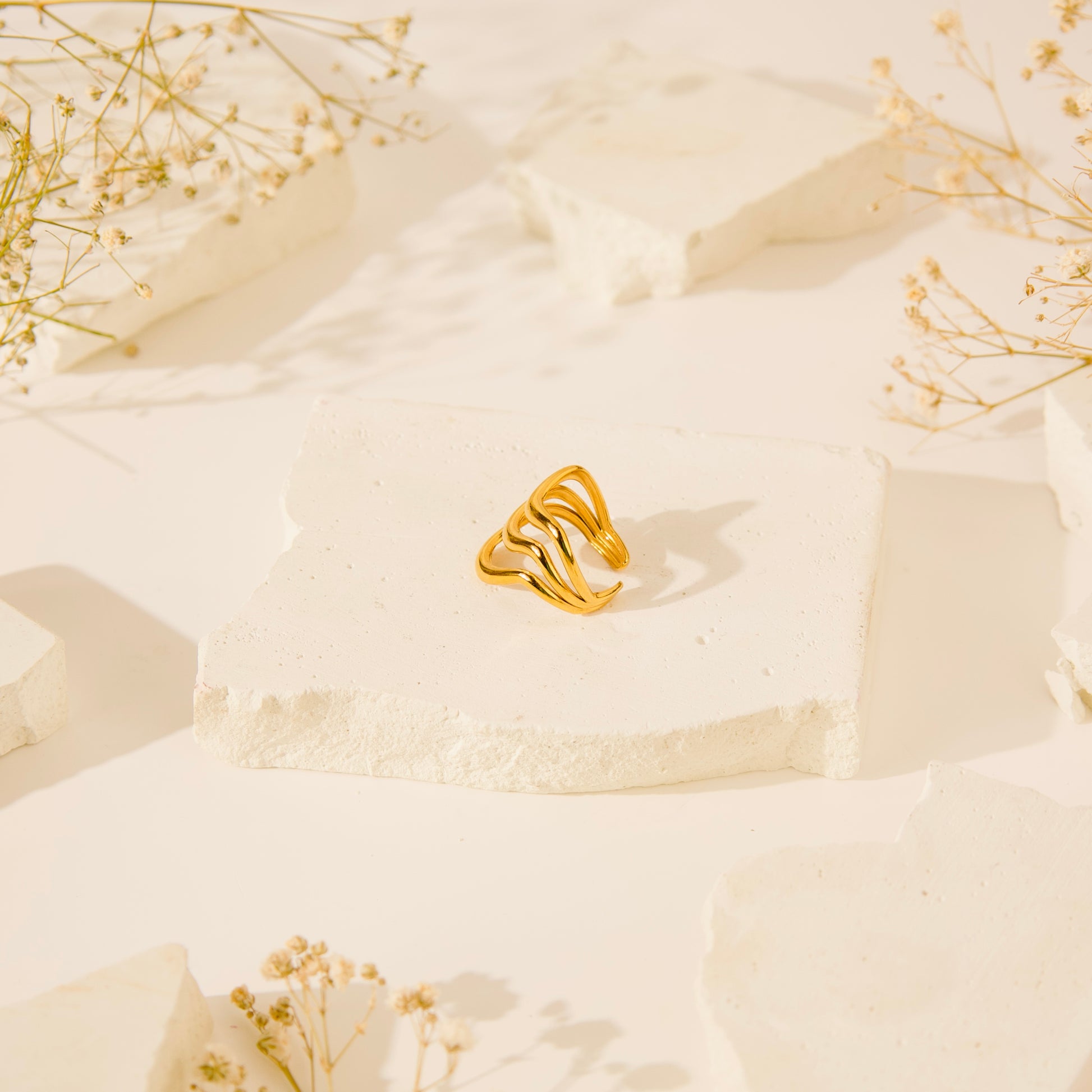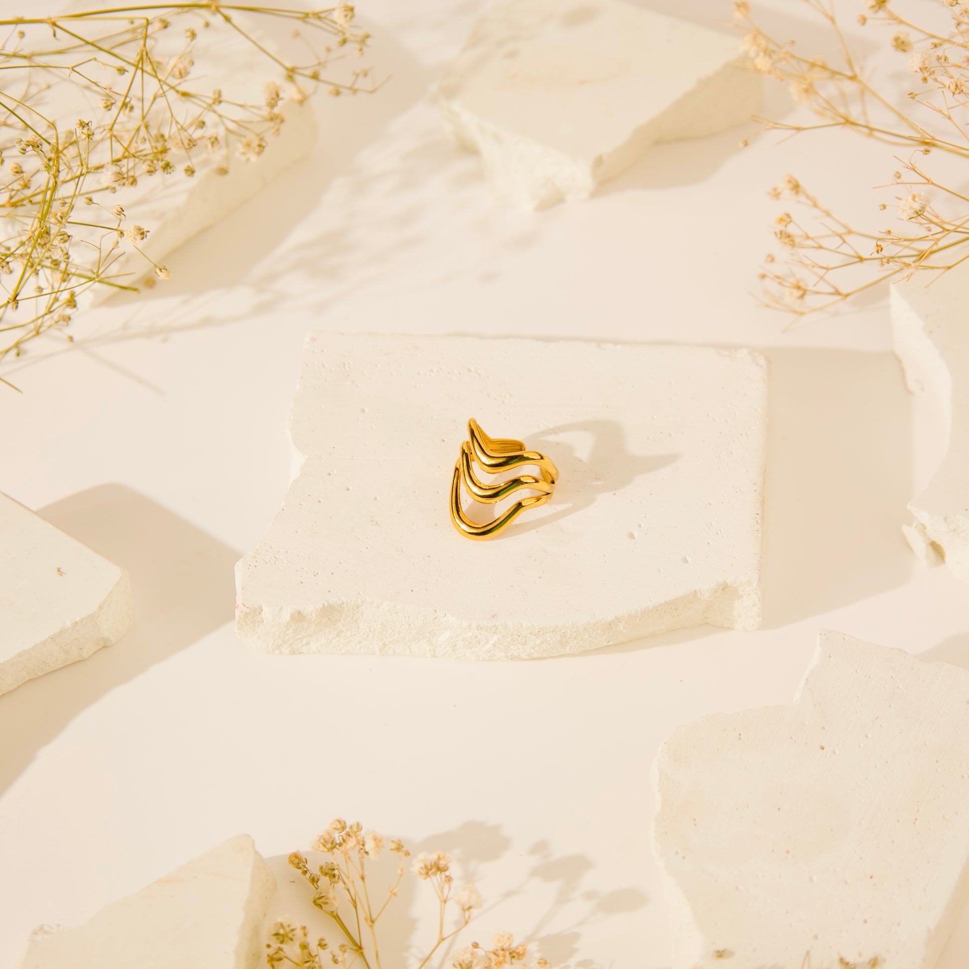 Crafted with 18KT gold plating, this daring Trio Flow Ring is skin-safe, waterproof, and designed for an adjustable fit that moves with you.